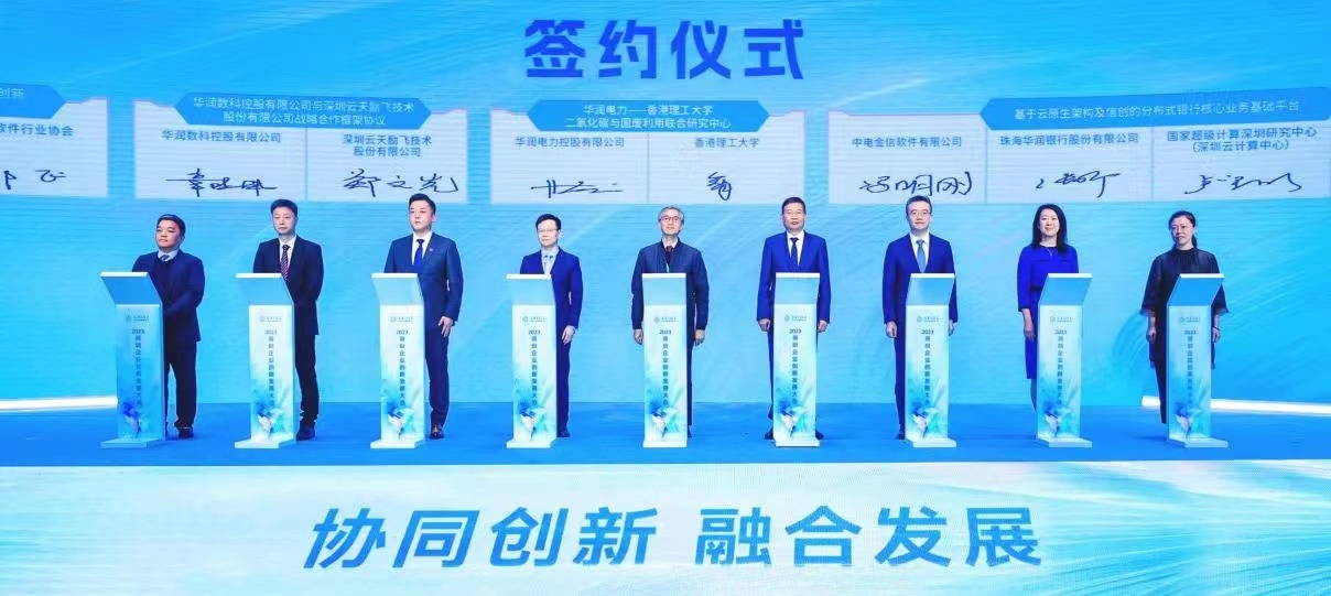中电金信常务副总经理(主持工作)冯明刚、华润银行首席信息官张昕、国家超级计算深圳中心(深圳云计算中心)主任卢宇彤、清华大学深圳国际研究生院科研处副处长姜玥璐代表各机构签约。