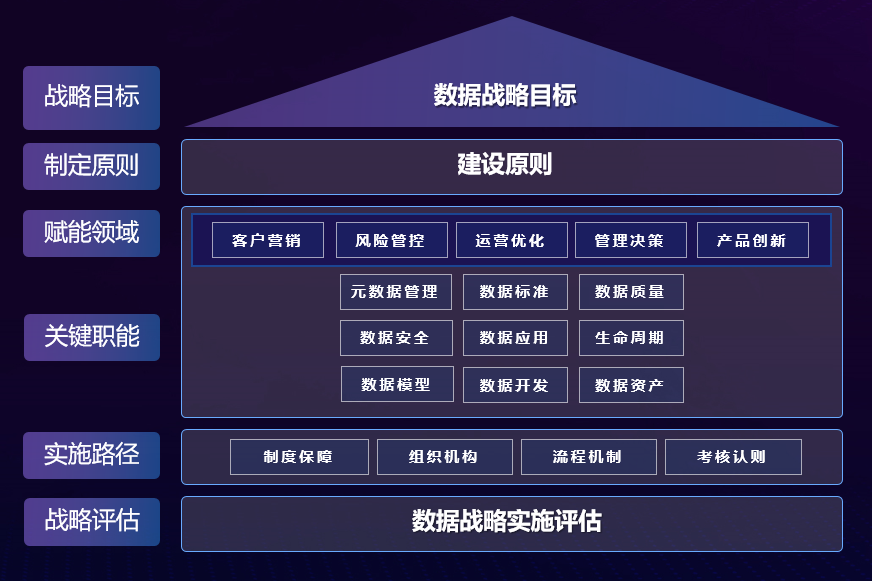 数据作为新兴生产要素,是核心战略资源,是数字化转型的核心驱动力。在数字经济环境下,企业应制定业务、技术、数据三位一体的战略规划,设计数据战略蓝图。明确数据驱动的战略愿景,制定数据治理、数据资产管理与运营、数据应用等各项能力举措,实现从筑牢数据基础到畅通数据共享,再到数据增值赋能的进阶提升。并制定科学可行的实施路径,不断深度挖掘数据要素潜力,提升数据资产价值,以全面赋能业务领域,实现降本增效和创新。