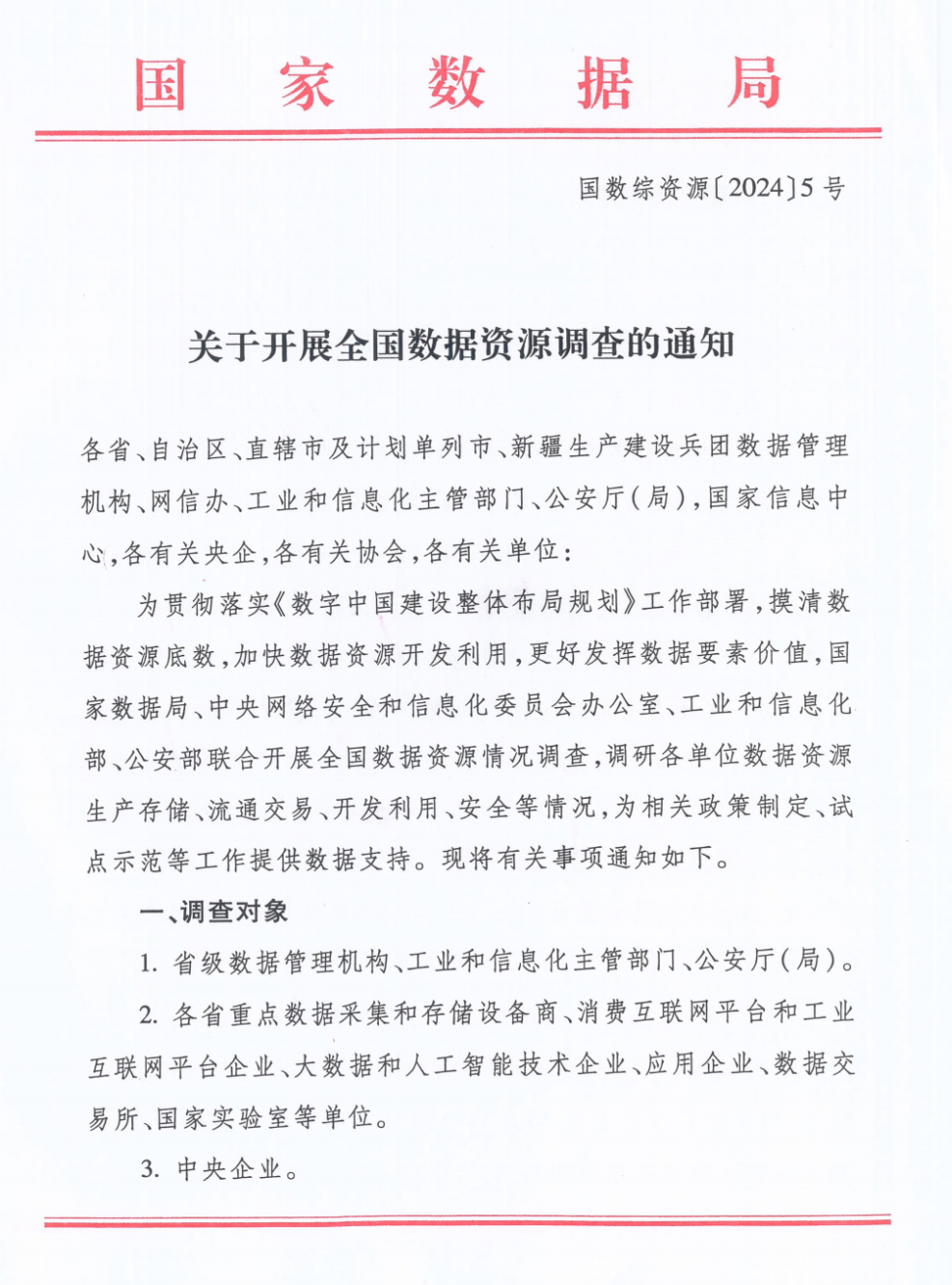 2月19日,国家数据局等四部门发布关于开展全国数据资源调查的通知。通知提出,为贯彻落实《数字中国建设整体布局规划》工作部署,摸清数据资源底数,加快数据资源开发利用,更好发挥数据要素价值,国家数据局、中央网信办、工业和信息化部、公安部联合开展全国数据资源情况调查,调研各单位数据资源生产存储、流通交易、开发利用、安全等情况,为相关政策制定、试点示范等工作提供数据支持。中电金信基于20多年的数据领域经验,及时为大家解读了相关要点,以下一文带你读懂《关于开展全国数据资源调查的通知》。