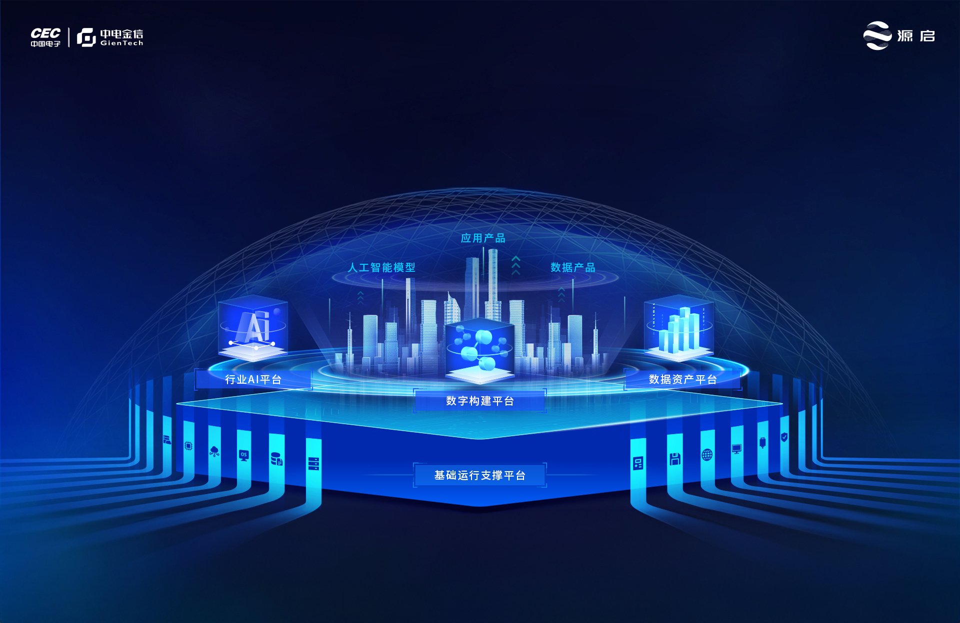 中电金信依托中国电子全栈自主计算产业链,采用新一代技术架构,打造新型数字基础设施“源启”。目前,“源启”已应用到260多项重大工程中,成为加快形成新质生产力、深入推进数字经济创新发展、推动高质量发展的新引擎。“源启”由基础运行支撑平台、数字构建平台、数据资产平台、行业AI平台构成,可汇集包括中国电子和生态合作伙伴的通用芯片、操作系统、大容量存储、高性能网络、服务器、终端、移动设备、云计算、虚拟化等基础算力元素,形成安全稳定、低能耗、性价比高的数字底座,一站式解决金融等重点行业基础软硬件自主创新、IT架构升级和数字化转型等难题。