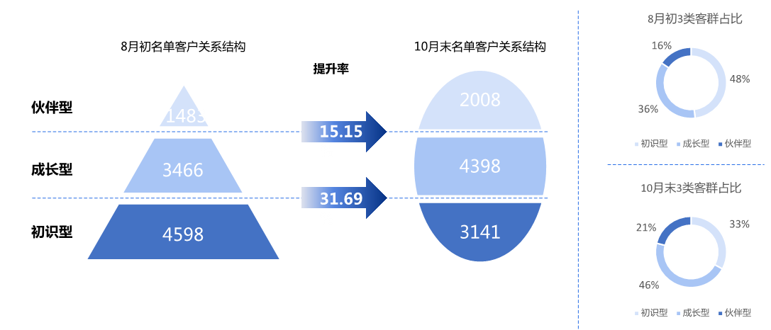 营销活动历时三个月,三类客群占比从期初【5:4:1】到期末【3:5:2】;初识型客户关系提升速度较快,是成长型客户关系提升速度2倍,初识型客群提升率31.69%,成长型客群提升率15.15%。