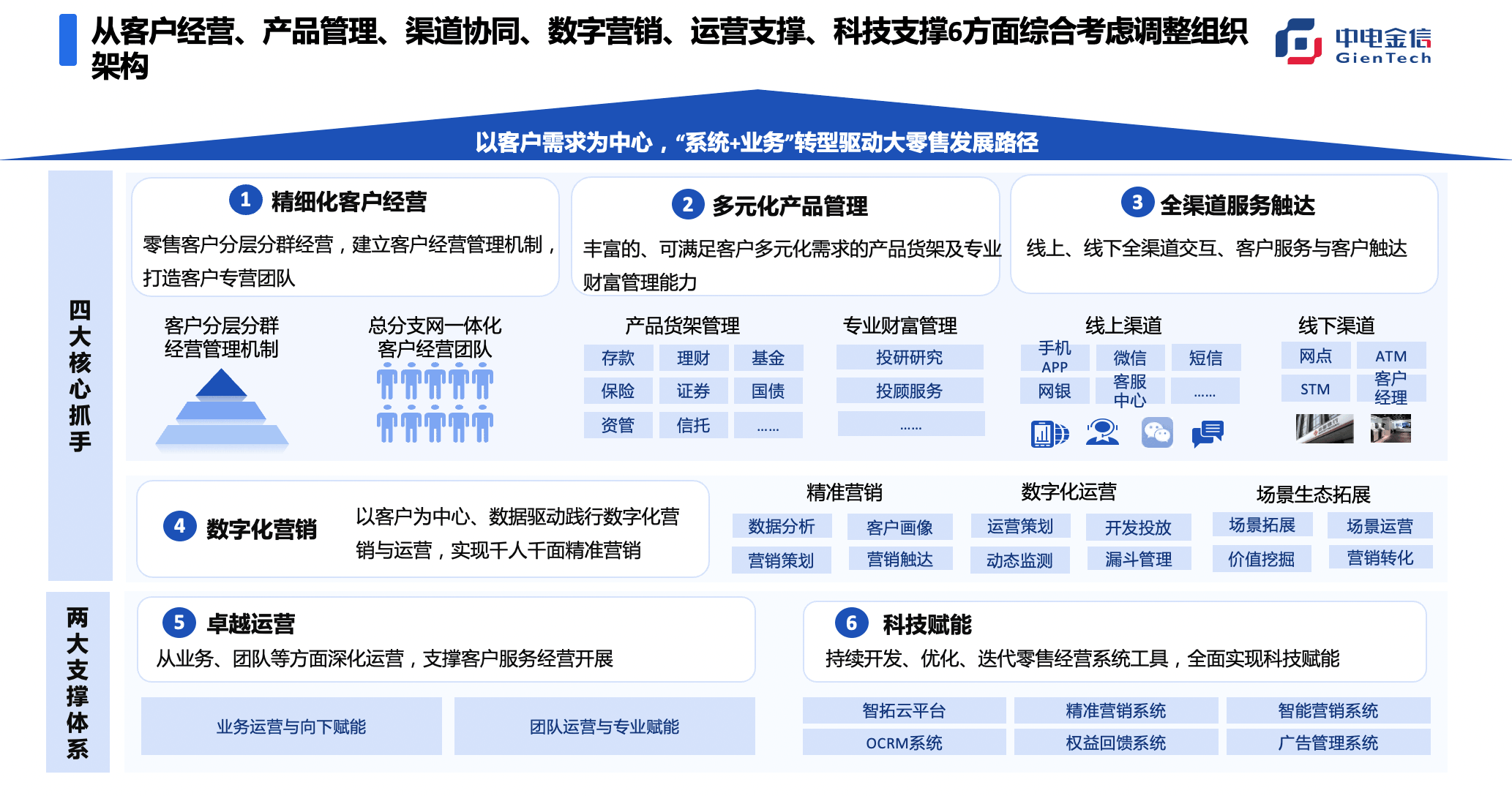 实现总、分支、网的组织架构优化、业务流程规划与管理体系建设,推进客户管理精细化与营销精准化、数字化、一体化。