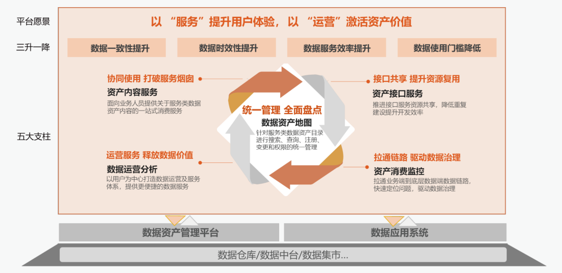 在全行范围内对数据资产进行盘点,通过资产内容服务、资产接口服务、数据运营分析、资产消费监控及数据资产地图五大支柱,实现数据一致性、数据时效性、数据服务效率提升,降低数据使用门槛,最终以“服务”提升用户体验,以“运营”激活资产价值。