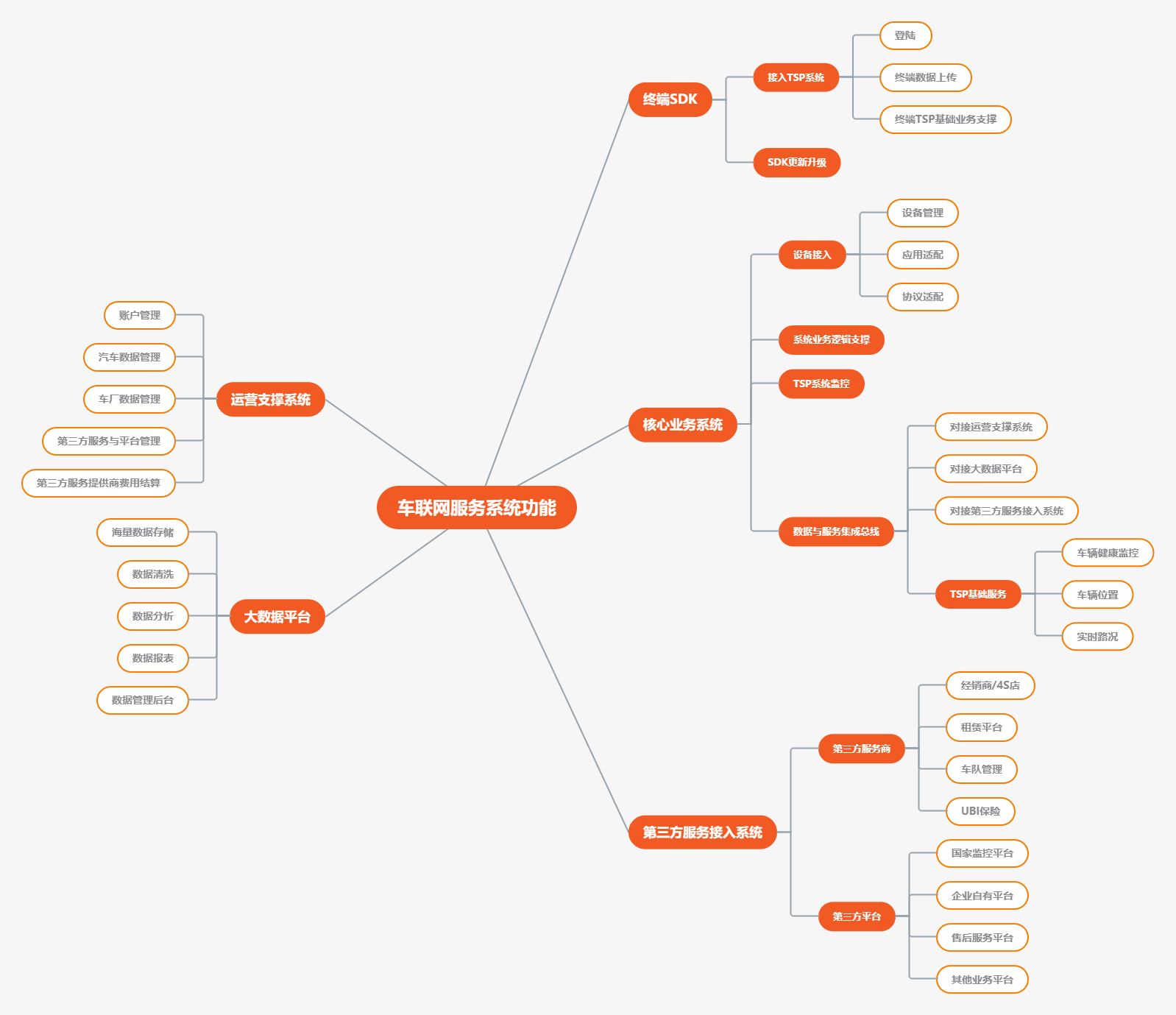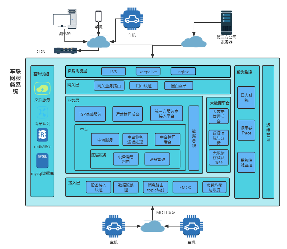 面向生产线、国家监控平台、企业自有平台、售后服务平台、其他业务平台提供核心车联网支持服务;