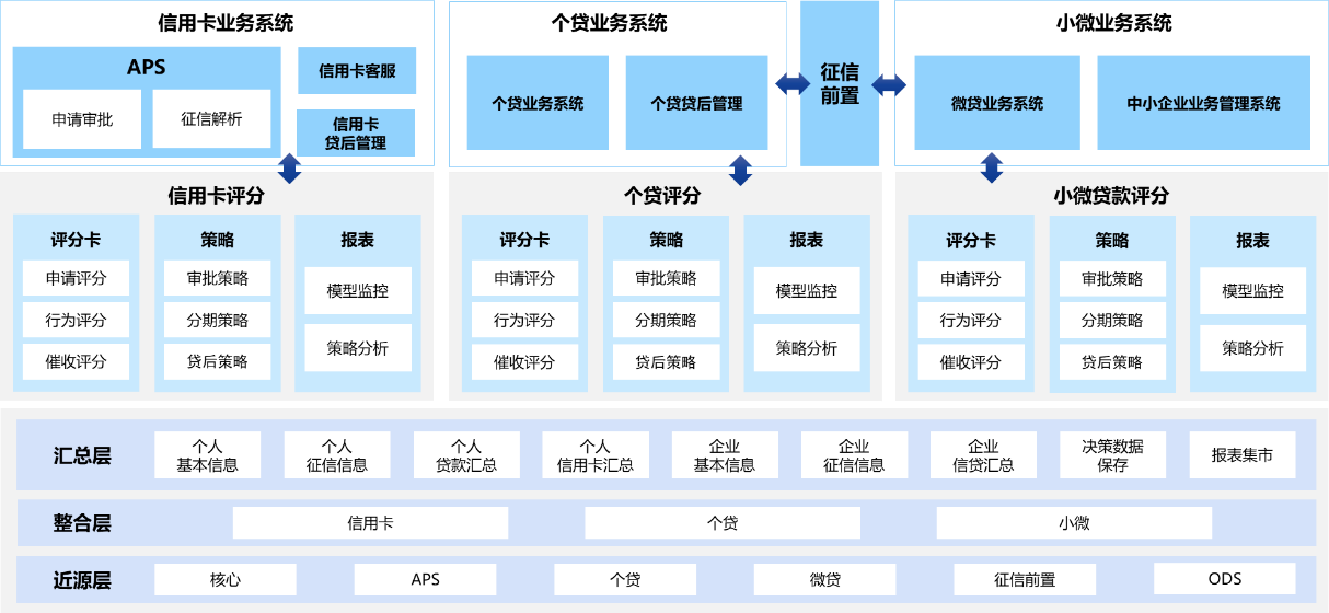 基于核心、个贷、信贷、APS等各业务系统数据,构建信用卡决策管理、个贷决策管理以及小微决策管理评分体系。