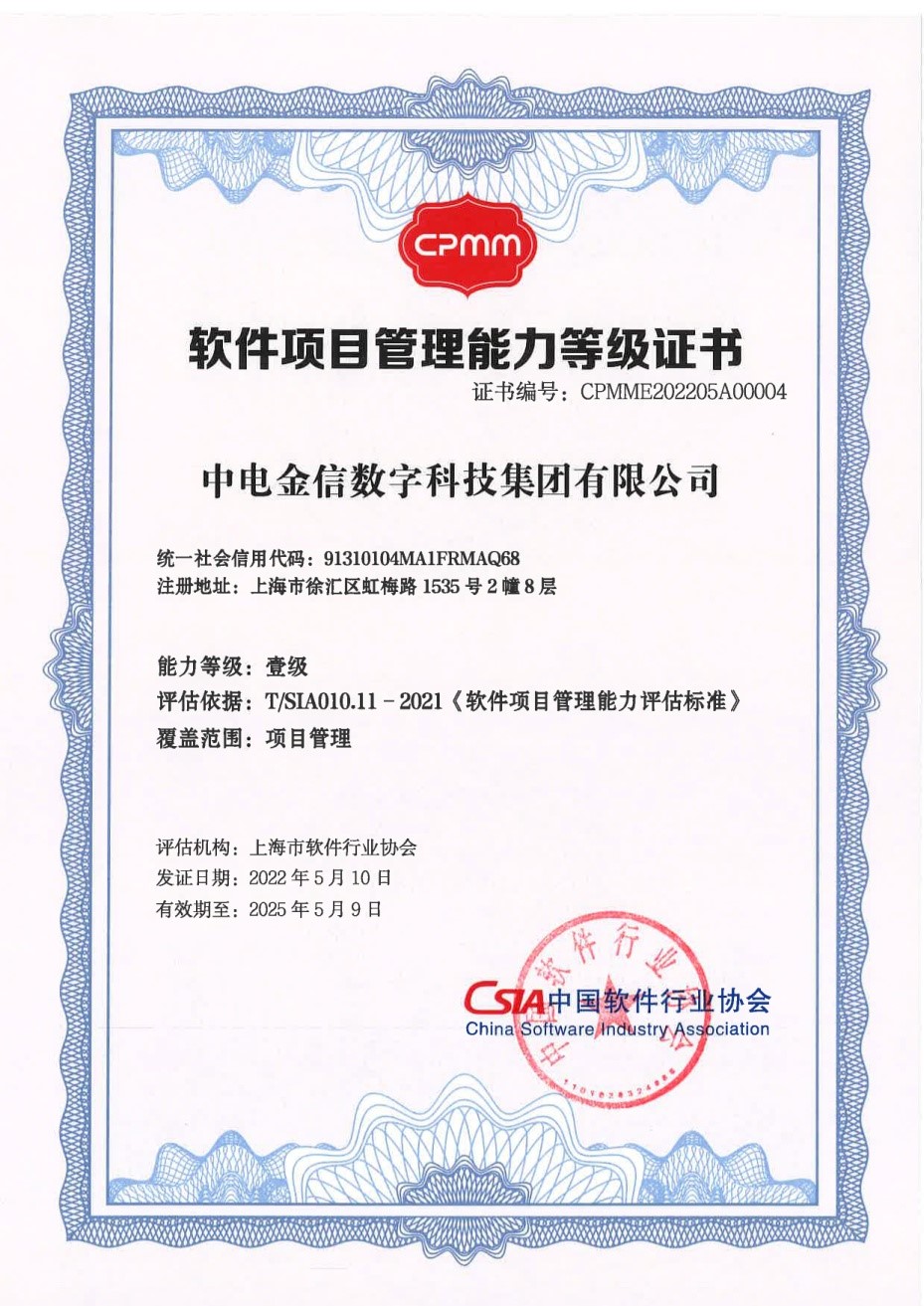 论坛上,中软协发布了“软件项目管理能力评估CPMM(Competency of Project Management Model)”项目发布。首批11家企业通过软件项目管理,现场颁发了成熟度评估证书。中电金信获得了CPMM评估最高等级的一级资质,彰显了其在国内项目管理方面的行业一流水平。