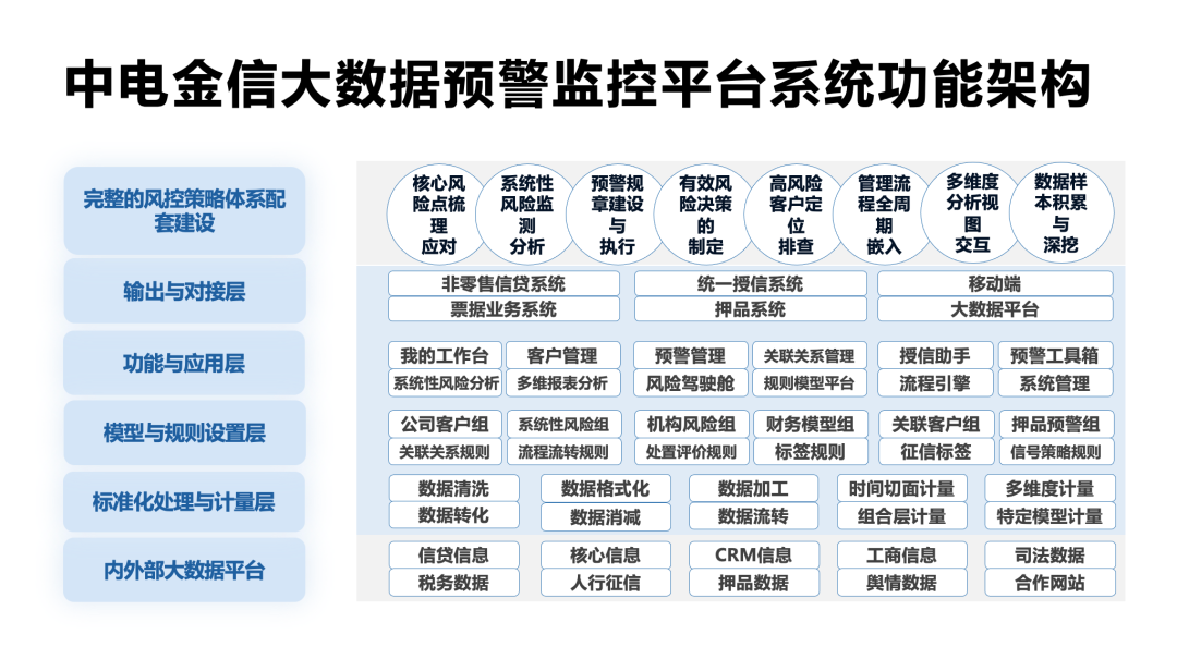 中电金信大数据预警监控平台通过以下手段实现风险管理的模型化、自动化、程序化,实现风险全流程有效管理: