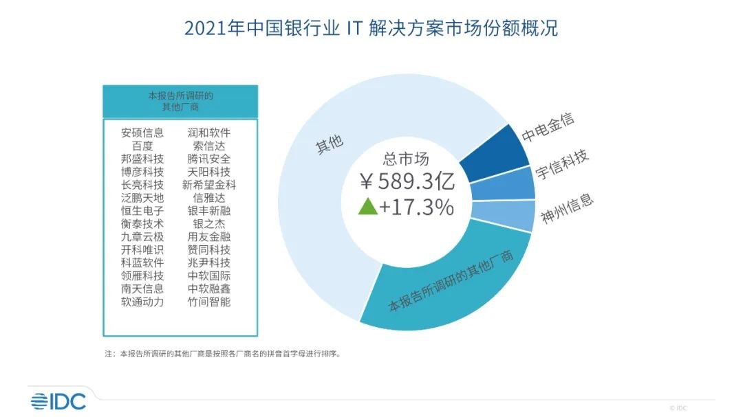 根据IDC的研究,2021年中国银行业 IT 投资规模达到 1557.1 亿元人民币,与 2020 年度相比,增长了11.8%,其中,IT解决方案市场的整体规模达到589.3亿元人民币,比2020年增长17.3%。中电金信以5.9%的市场份额位列第一。