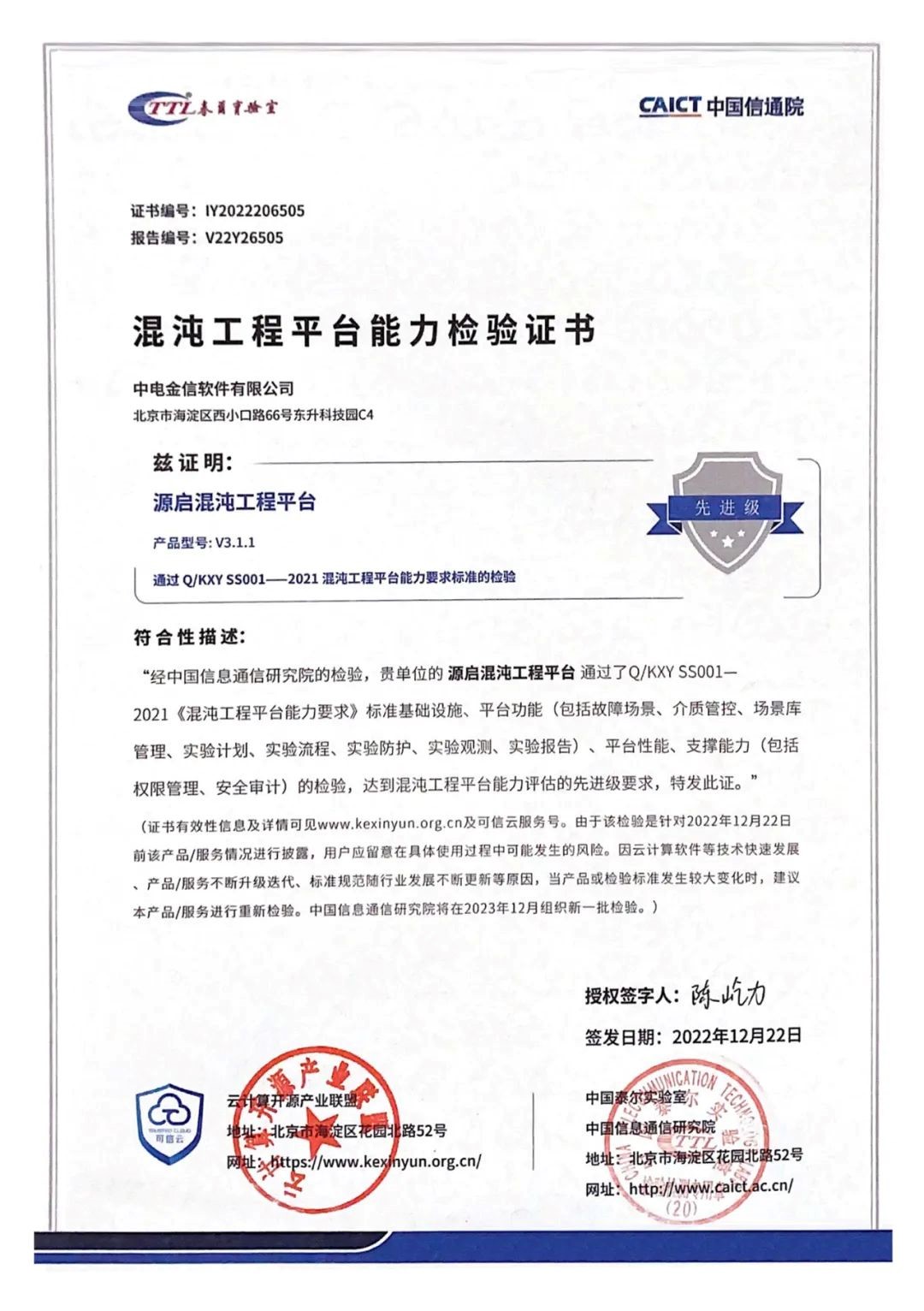 12月22日,中电金信源启混沌工程平台通过了中国信通院混沌工程平台能力评估最高等级——先进级能力检验,标志着中电金信源启混沌工程平台在标准基础设施、平台功能、平台性能、支撑能力等方面,各项技术能力达到行业领先水平,满足金融机构通过混沌测试增强分布式系统稳定性的能力需要。