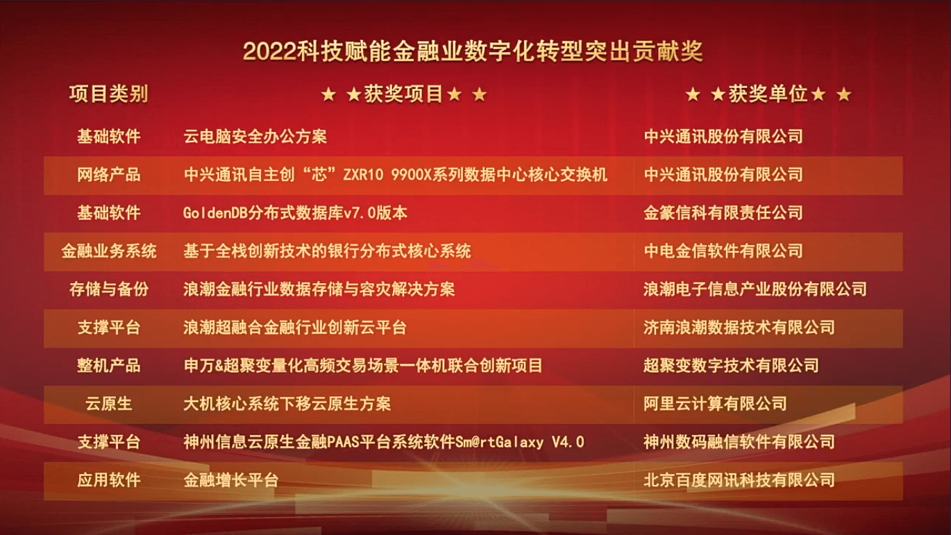 12月27日,由《金融电子化》杂志社主办的“2022中国金融科技年会暨第十三届金融科技应用创新奖颁奖典礼”成功举办。中电金信“基于全栈创新技术的银行分布式核心系统”经过层层遴选,斩获“2022科技赋能金融业数字化转型突出贡献奖”。