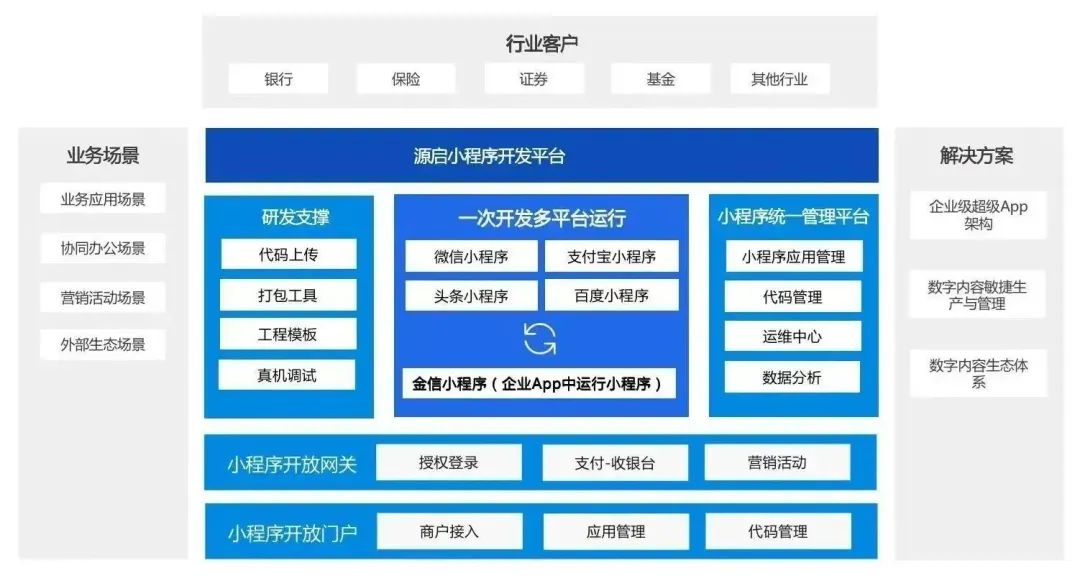 即开即用、动态更新、性能接近原生、开发成本低,小程序已成各大金融机构布局商业的重要阵地。以“金融服务App+小程序”有机联动的企业级超级App应运而生。在此背景下,中电金信源启移动开发平台功能焕新升级,源启小程序开发平台应运而生,为企业提供一站式小程序服务,扩充、打通以“App为主+小程序为载体”的渠道生态体系。 源启小程序开发平台基于源启金融级数字底座底层技术能力构建,安全、可靠。平台由一次开发多平台运行架构、小程序SDK、IDE小程序插件、小程序统一管理后台、小程序开放平台组成,金融客户可以通过该平台高效开发、定制小程序。