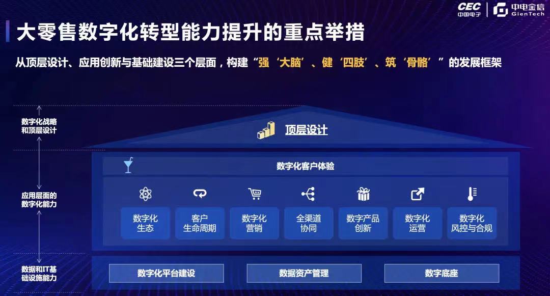 “强大脑、健四肢、筑骨骼”,中电金信从商业银行的顶层设计、应用创新与基础建设三个层面,有的放矢地阐述了商业银行大零售数字化转型之路变革之道,为商业银行零售数字化转型提供有益思路。