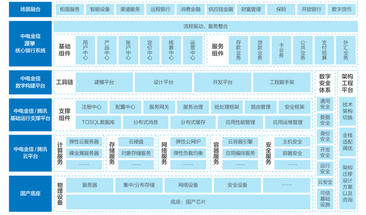 顺势而为,中电金信与腾讯云共同打造联合核心方案,旨在解决银行核心重构的最后一公里的落地难题。联合核心方案以中电金信“源擎”云原生分布式核心业务系统构建,基于中国电子金融级数字底座“源启”,结合腾讯云基础设施,支持云原生和单元化,面向银行机构实现全栈国产化落地,具备高性能、高可用、高安全和可动态弹性扩展能力,为金融用户提供关键的核心业务处理能力。