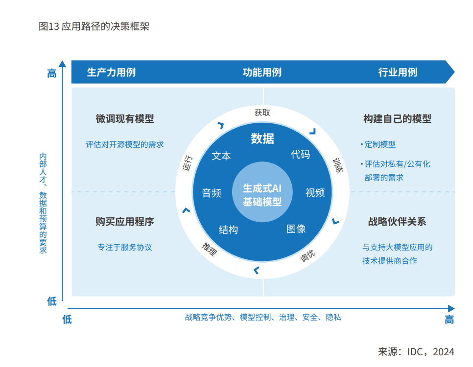 当前,不同类型的金融机构在推进大模型的落地中,需根据自身战略目标、业务需求、技术能力、资源禀赋、风险偏好来决定是否自主建设、基于已有模型微调,或是另辟蹊径借助其他方式来汲取GenAI的能力。同时,IDC指出,金融机构在落地大模型的过程中,需要综合考虑打造数据价值链管理、模型的选择与部署、AI平台搭建、以及AI治理等要素能力。其中,数据价值链管理堪称生成式AI在金融场景中释放价值的基石,其核心目的是提升数据质量、数据可用性以及确保数据的合规获取,助力金融机构针对不同的应用场景快速构建高质量的数据集,并为后续金融大模型的规模应用筑牢根基。