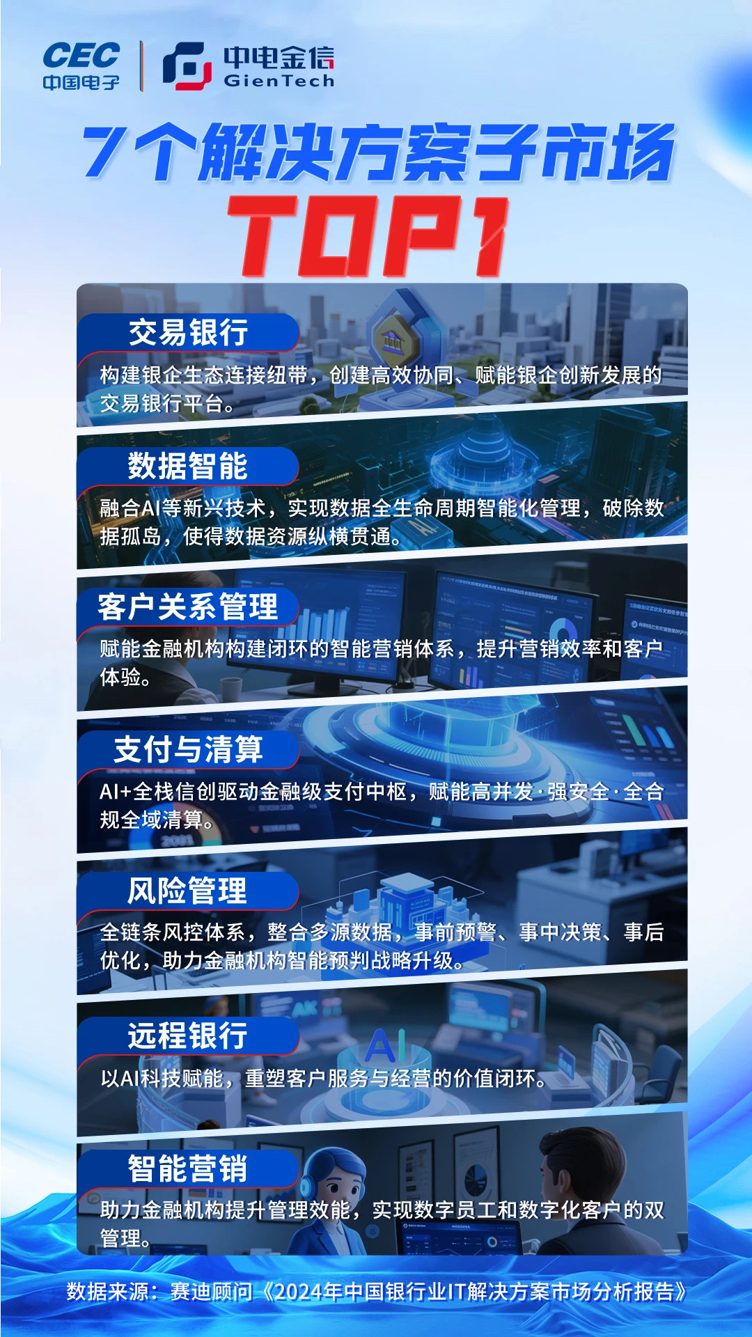 7月1日,工信部赛迪研究院赛迪顾问正式发布《2024年度中国银行业IT解决方案市场分析报告》。报告显示,中电金信以7.43%的市场份额,七度蝉联中国银行业IT解决方案市场份额榜首,并在数据智能、支付清算、风险管理、客户关系管理、远程银行、交易银行、智能营销七个解决方案子市场排名第一。