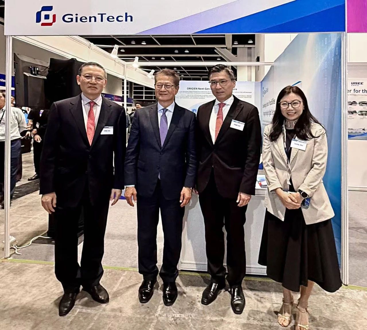 【左起:香港资讯科技联会副会长侯东迎、香港特区政府财政司司长陈茂波、香港特区立法会议员(科技创新界)邱达根、中电金信港澳事业部总经理朱巧琳】