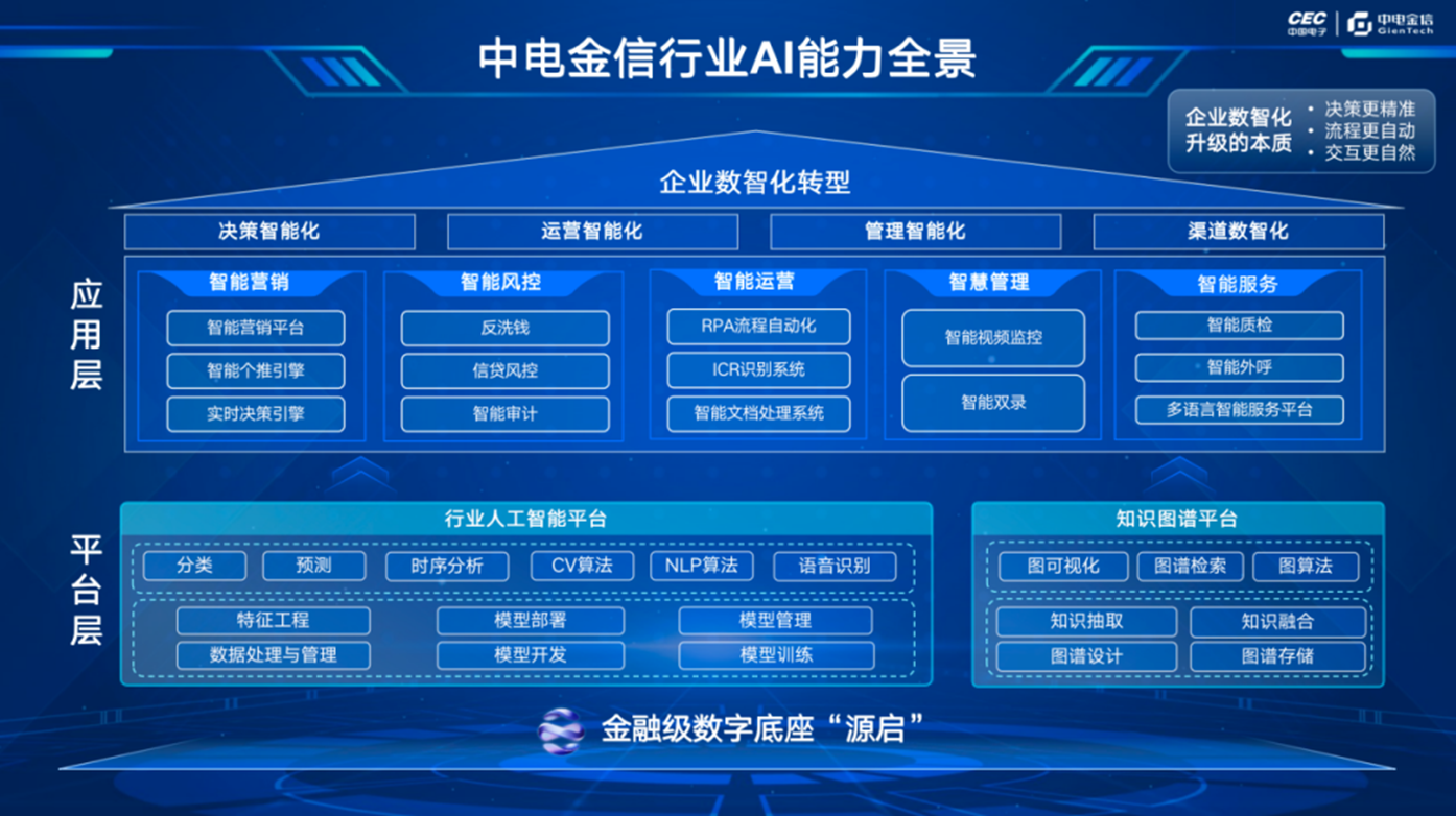 面向行业,中电金信依托自身深耕金融等重点行业二十余年的沉淀积累,形成了以金融级数字底座“源启”为支撑,“两大平台+五大应用场景”的AI能力全景。