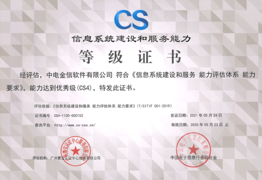 2021/06/09中电金信通过信息系统建设和服务能力评估体系CS4级权威认证