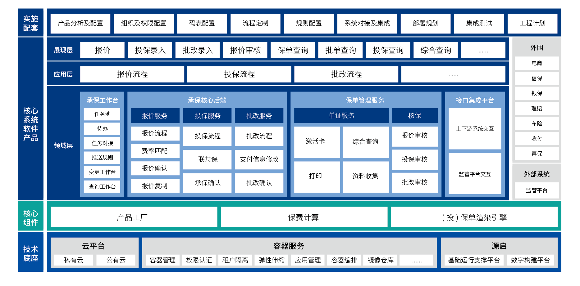 中电金信财险非车核心系统, 以自主创新为基石,融合了分布式架构、DevOps 容器等先进的云原生技术, 显著提升系统开发和运行效率。通过产品工厂与承保业务有机结合, 实现产品快速配置,基于产品模型驱动 承保业务的快速同步,支持多业务模式、差异化的承保和批改流程产品;通过保费计算引擎和保单渲染引擎 技术支持,实现了高度的扩展性和灵活性,赋能业务专业化、智能化运营, 提升了运营效率和风险管控能力。