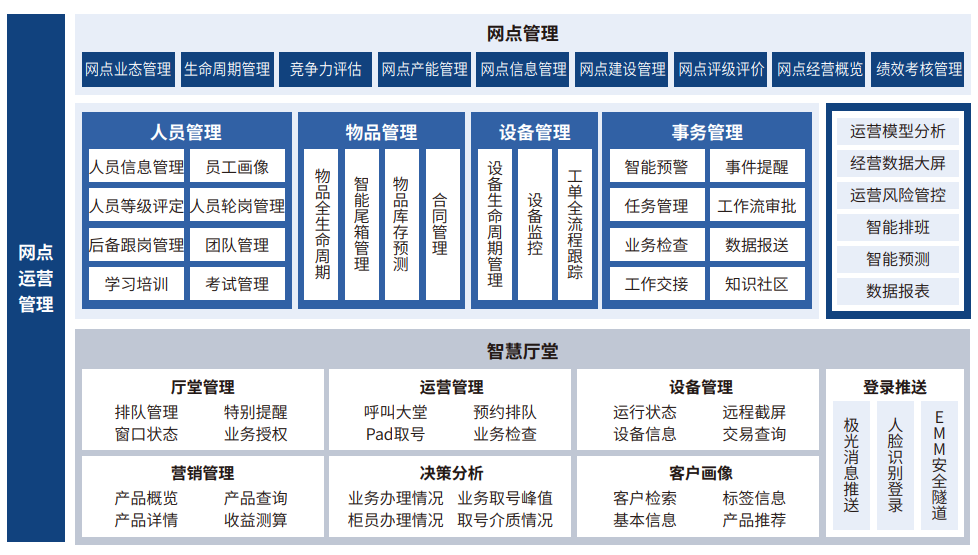 网点运营管理解决方案分为网点数字化运营业务方案及智慧厅堂PAD业务方案,其中网点数字化运营业务方案对网点管理、人员管理、物品管理、设备管理、事务管理、操作风险、运营分析、智能预测、监控大屏等多方面功能进行整合;智慧厅堂PAD业务方案通过客户识别、客户服务、精准营销、精细化运营管理等具体措施,打造网点一体化营销服务和运营新模式。