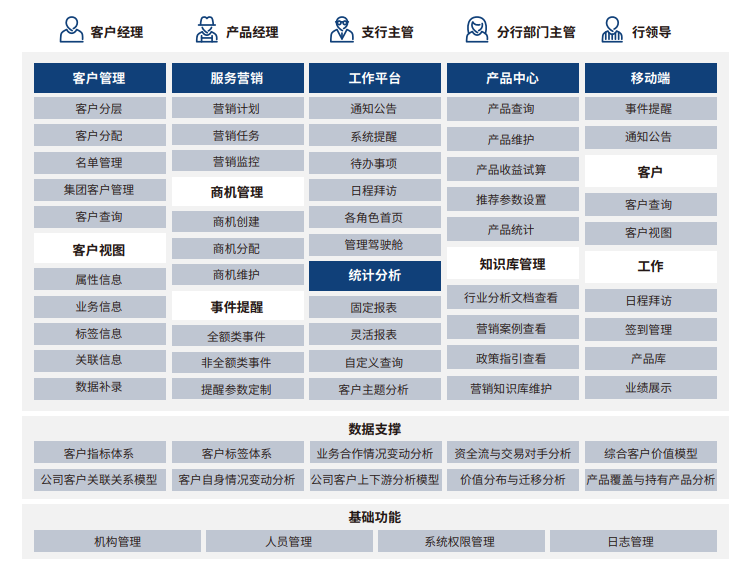 该系统是金融行业对公客户精细化管理、营销和运营的数字化管理平台,聚合了工作平台、客户管理、服务营销、产品中心、数据统计分析和移动端等功能模块,帮助用户挖掘存量客户价值,把握客户动向,避免客户流失。同时也能为用户提供潜在客户开发和营销工具,提升客户转化率,为各层级管理人员快速了解经营状况以及客户经理业绩情况提供数据支撑。