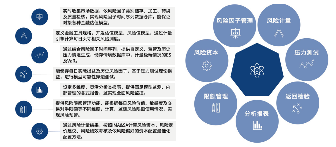 风险因子管理、情景管理、产品估值、VaR/ES计算、敏感度计量、损益加工、回归分析等。