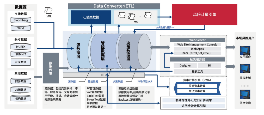 统一归集相关数据,构建市场风险的数据模型,实现与风险计量引擎的交互和数据管理(数据质量控制、数据存储管理、数据安全访问控制)。