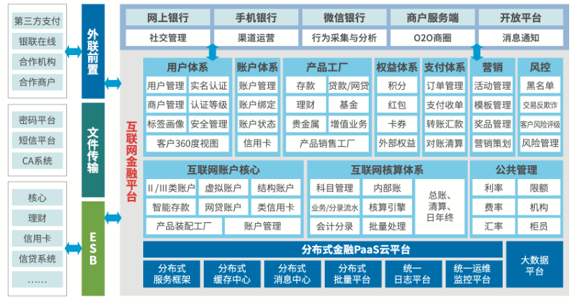 互联网银行产品和服务从客户体验与客户价值出发,强调营销和风控管理,重视主动获客。基于开放式生态系统体系考虑,强调外部合作、共享、开放互联,提供线上及创新业务发展支持,采用云计算、分布式、大数据等新技术及“去中心化、微服务”理念,强调平台扩展性和灵活性的能力,通过业务创新和科技创新、敏捷迭代开发与应用,及时响应和满足业务快速变化的需求。