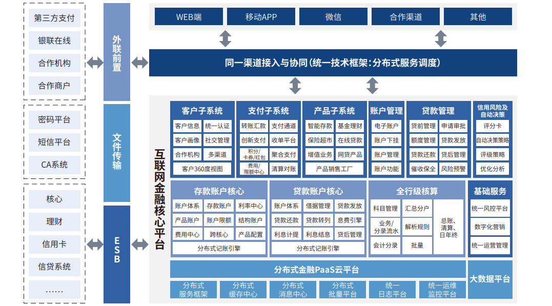 存款核心与贷款核心分离、相互独立。但基于同一套技术平台,可采用RPC、ESB等多种方式调用。