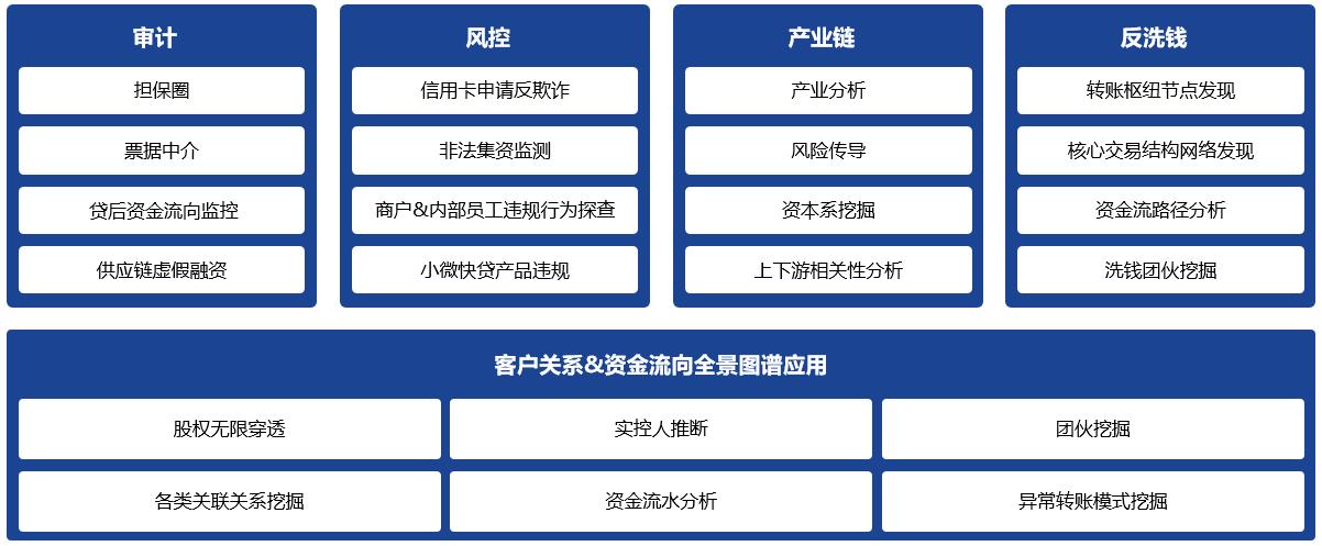 构建“个人、企业、机构、账户、交易、以及行为数据全量图谱,融合规则、图算法和机器学习等技术手段,有效挖掘隐藏在海量客户信息和业务数据下的审计线索。