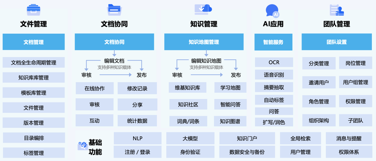 企业知识管理 | 为企业提供知识资产的获取、存储、使用、创新的全生命周期管理功能。通过知识门户、知识智能搜索、维基知识库、知识地图、词典词条、社区问答和知识推送等工具来确保知识能够在业务中进行流通和赋能。