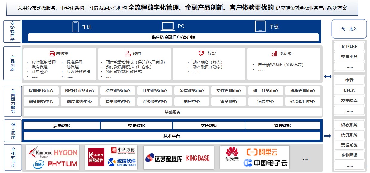 已同飞腾、鲲鹏、达梦、人大金仓、东方通等国产基础设施完成全栈式适配,形成信创全栈式一体化支撑平台,满足全国产化供应链金融服务平台高可用和高性能的要求。