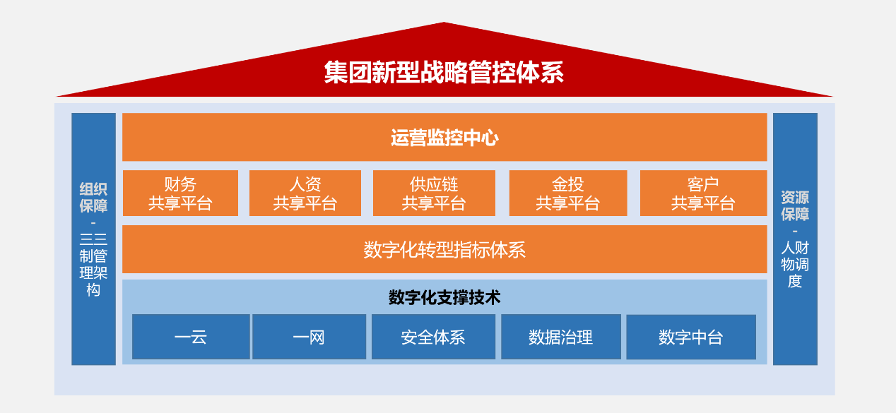 集团数字化运营管控体系主要包括:构建“两提两控”数字化指标体系,建设运营监控中心,以及财务、金融投资、人力资源、客户、供应链等五大共享平台,建立全要素数字化管控平台。