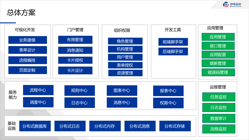 根据企业的管理方式和需求特点,零代码或低代码开发生成企业应用;提供高低代码相结合的方式,实现复杂业务场景开发;多应用的开发管理、版本管理;提供统一门户集成各业务应用。