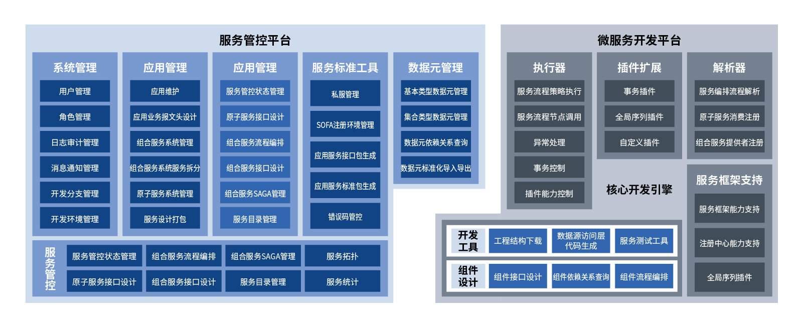 中电金信分布式应用开发平台是一套完整的满足金融IT标准的轻量级分布式微服务平台解决方案,具备快速设计、快速开发、快速部署的高可用、高可靠、可视化特性。