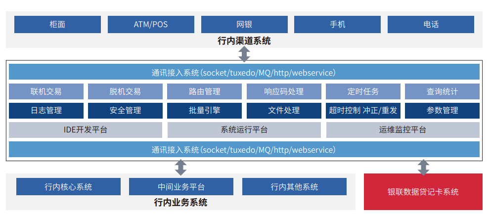 中电金信信用卡前置系统是一个集开发、测试、业务运行、系统管理等于一体的技术平台和业务平台,由业务处理模块、通讯网关模块、批量模块、管理监控模块等部分组成。业务处理模块和通讯网关模块是平台的核心业务支撑模块。信用卡前置采用OSGI+spring+camel+hibernate框架来实现,具有技术架构领先、性能高效稳定、整合能力强大、业务支持范围广,系统可扩展性强,快速定制发布新业务。