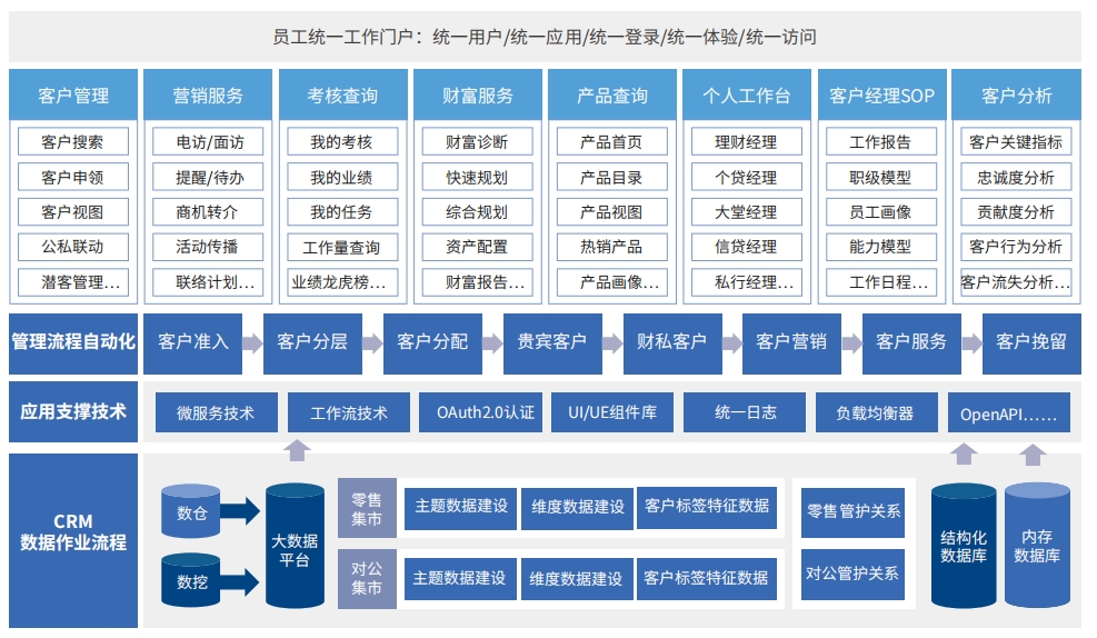 在金融机构客户关系管理系统项目的规划中,中电金信主要从三个层面来构建CRM的整体能力: