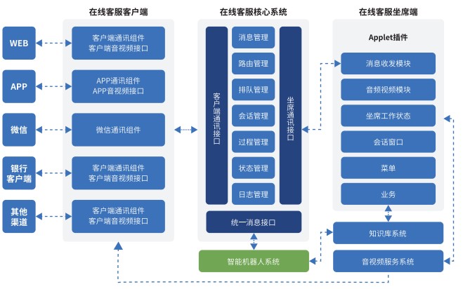 在线客服系统由三部分构成,分别是客户端、管理端和坐席端。