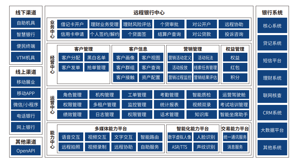 中电金信远程银行解决方案可帮助银行构建集约化的客群运营、内容运营、活动运营、流量运营和权益运营能力,协同全渠道开展高效能主动营销、事件营销和智能外呼营销,同时向各渠道、各业务系统提供客户信息共享服务,是银行提高营销产能的坚实后盾。