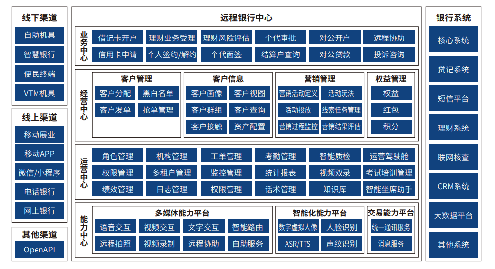 该系统可单独组建,也可通过改造客户服务中心构建,因此具有组织和运营银行业务的职能。系统可实现全渠道的协同,即从电话、视频、微信、小程序、VTM、网站、短信、APP等渠道均可接入,以进行统一客户识别,展现客户360视图。