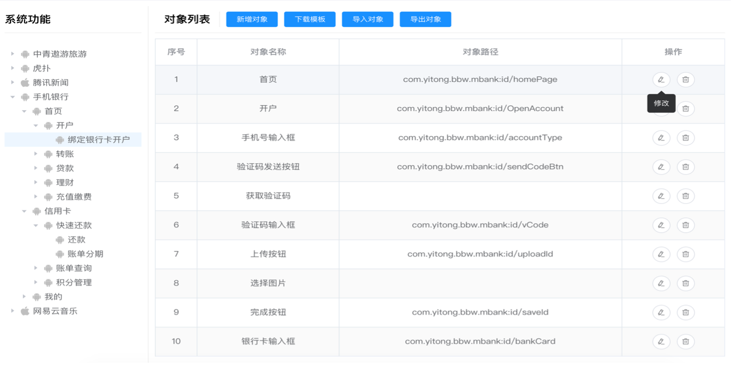 测试对象管理:对象管理模块可以通过模板导入的方式,快速新增页面操作对象。