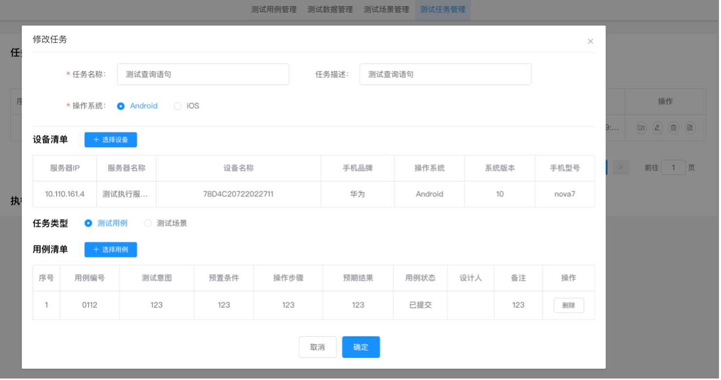 测试任务管理:测试任务里可以选择执行用例或场景,支持选择执行设备。执行结束后可以查看执行结果。