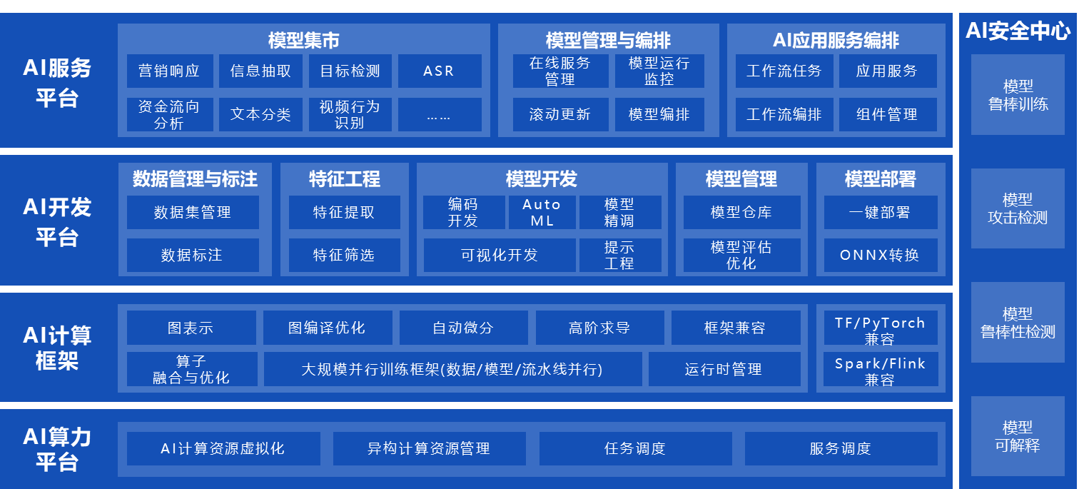 基于全新的MLOps理念,采用业内领先技术,打造的全链路、端到端的AI算法开发套件和工具,实现复杂模型研发和服务一体化平台,满足全栈模型,机器学习、深度学习和大模型训推一体的全生命周期管理。通过企业级AI服务中台实现AI模型的统一化纳管和标准化服务,实现“大小模型协同”管理,满足“便捷的算法开发、算力集约化管理、超大规模AI训练、AIPaaS服务化以及AI安全可信”等行业共性需求,助力企业智能化升级。